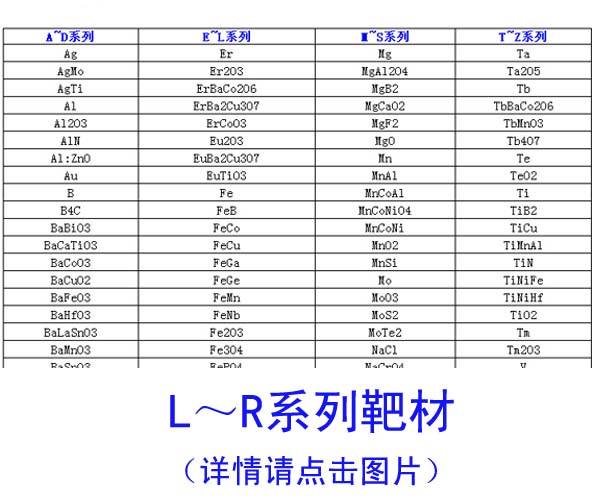 | La | LaSrFe03 | LuFe204 | MgA1204 | Mg2TiO4 | Nb(铌)靶 | NiFe | PbMgNb03 | Rh |