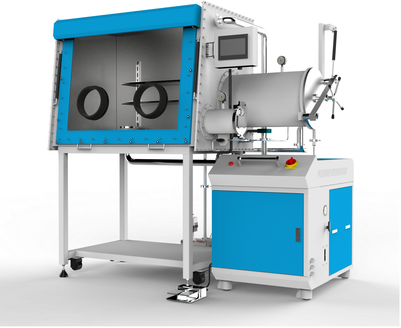 前级室 | 计有两个前级室 大前级室尺寸:内直径360mm,外长745mm内长600mm大过渡舱(右边操作),采用气弹簧式开门方式,过渡舱内有可滑动托盘